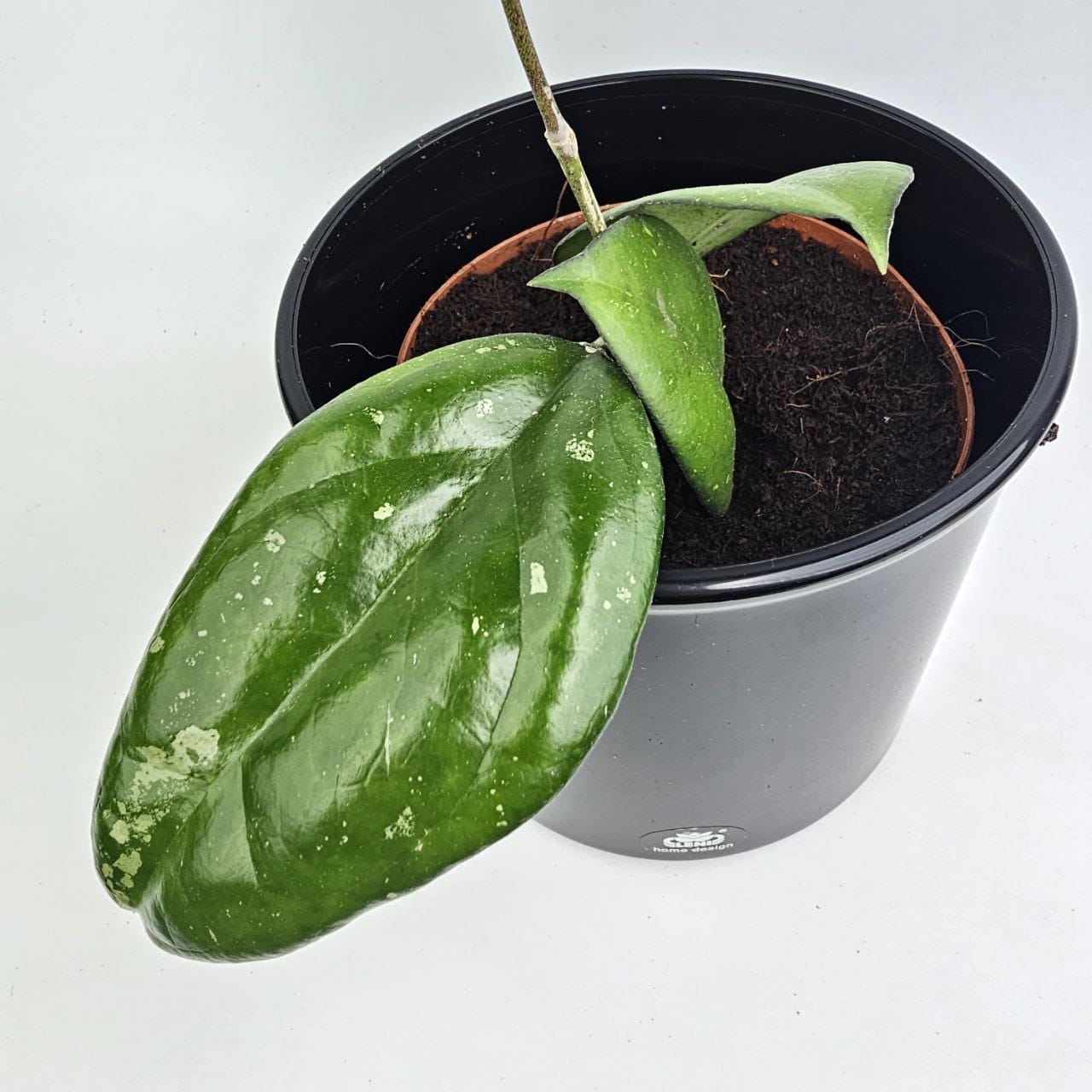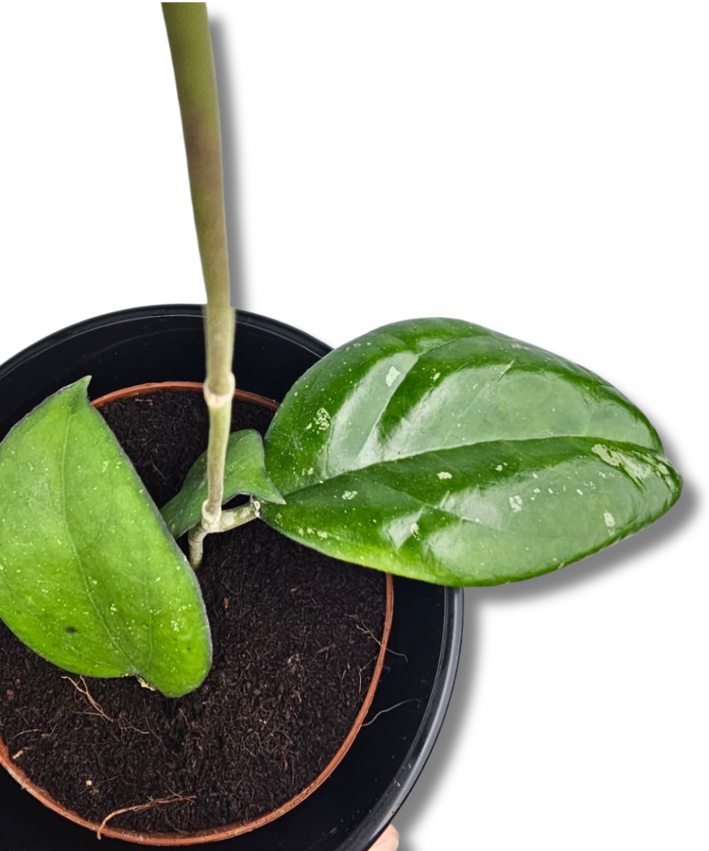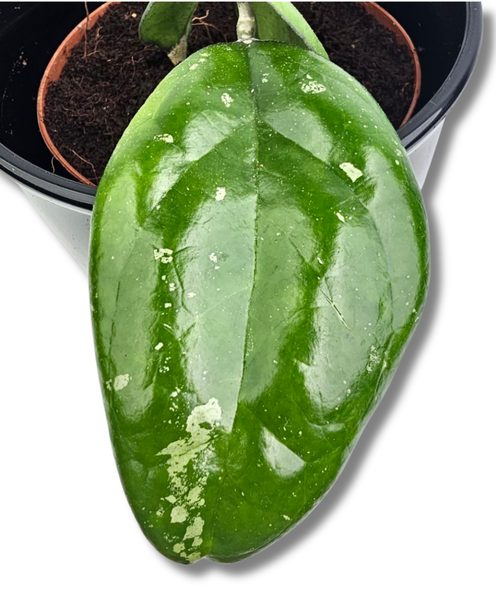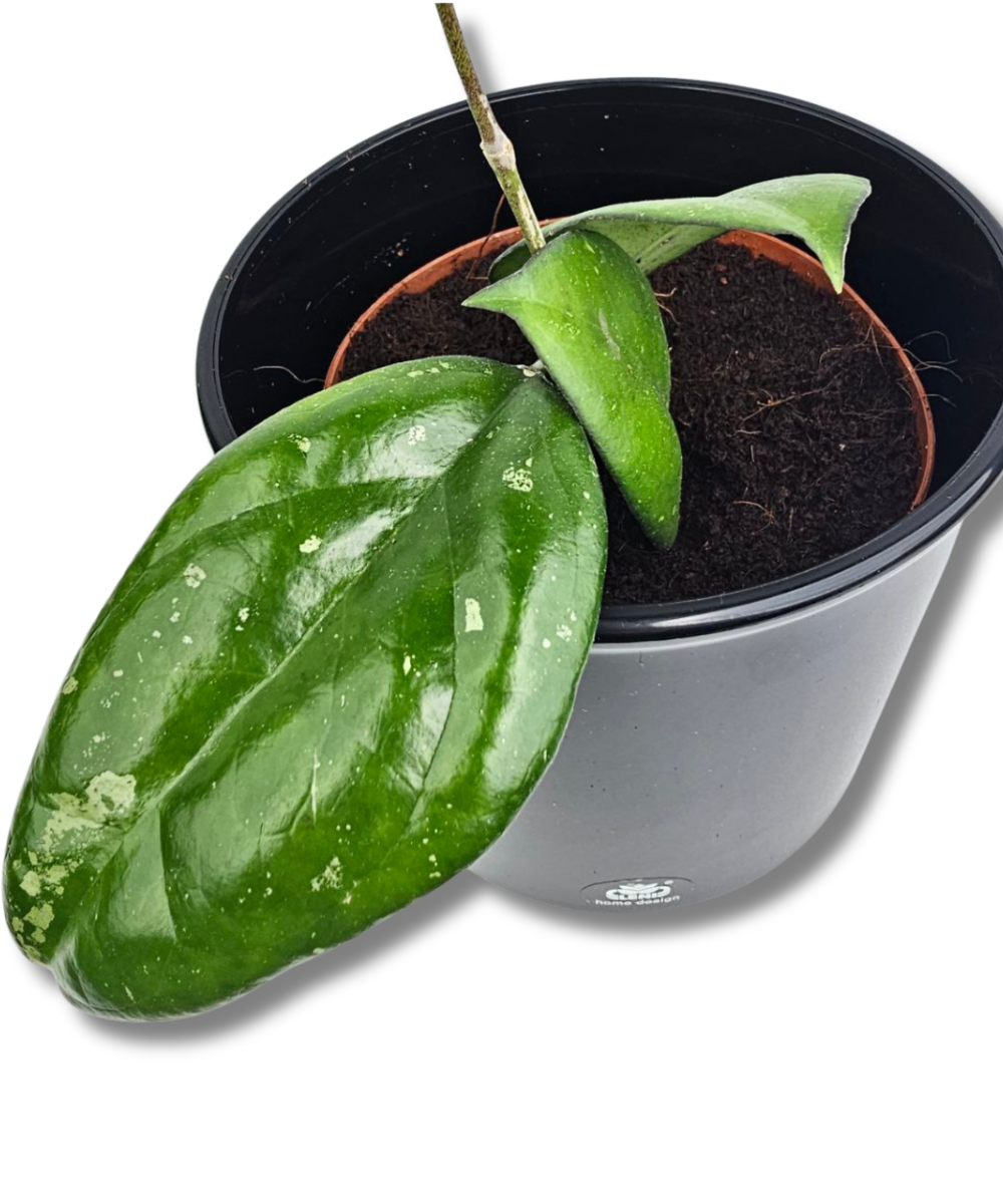 Hoya ‘Joy’ to dekoracyjna, kolekcjonerska odmiana o grubych, błyszczących liściach z delikatnym srebrzystym splash’em. Blaszki są lekko wydłużone, mięsiste i wyraźnie zaznaczone nerwami, a nieregularne, jasne nakrapianie nadaje roślinie elegancki, świeży wygląd.