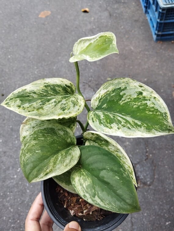 Scindapsus 'Wallet Sakti' to rzadko spotykana odmiana pnącza, wyróżniająca się grubymi, mięsistymi liśćmi o aksamitnej strukturze i głębokim zielonym kolorze. Na powierzchni blaszki liściowej pojawiają się srebrzyste, nieregularne plamy, nadające roślinie unikalny, lekko połyskujący efekt., przypominający wzór moro.