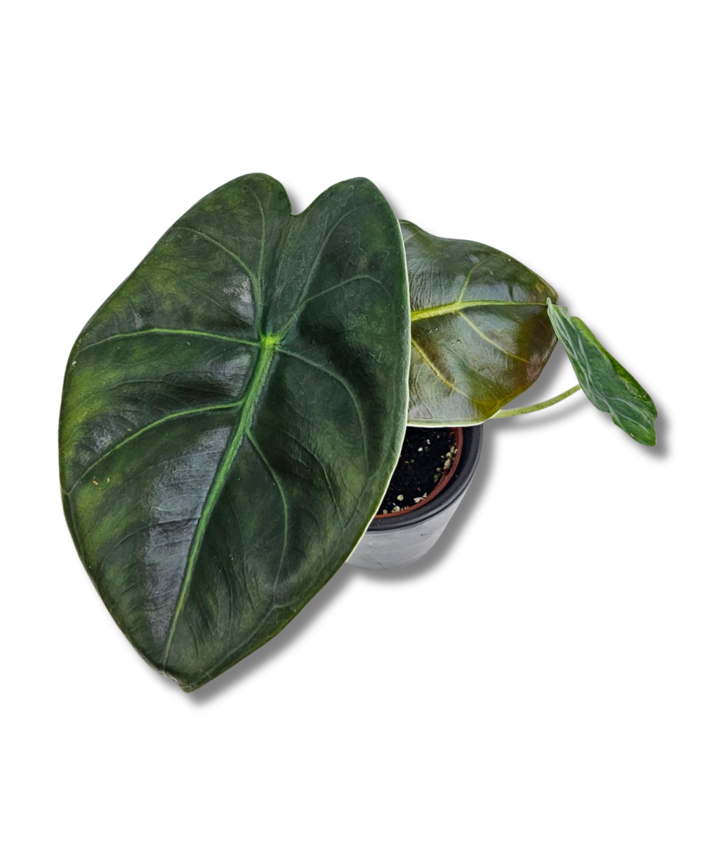Alocasia Golden Bone to kolekcjonerska odmiana o atrakcyjnych skórzastych, ciemnozielonych liściach z opalizującym połyskiem i jasnym kontrastowym nerwem głównym. Dodatkową ozdobą tej odmiany są ciemne, bordowe spody liści.