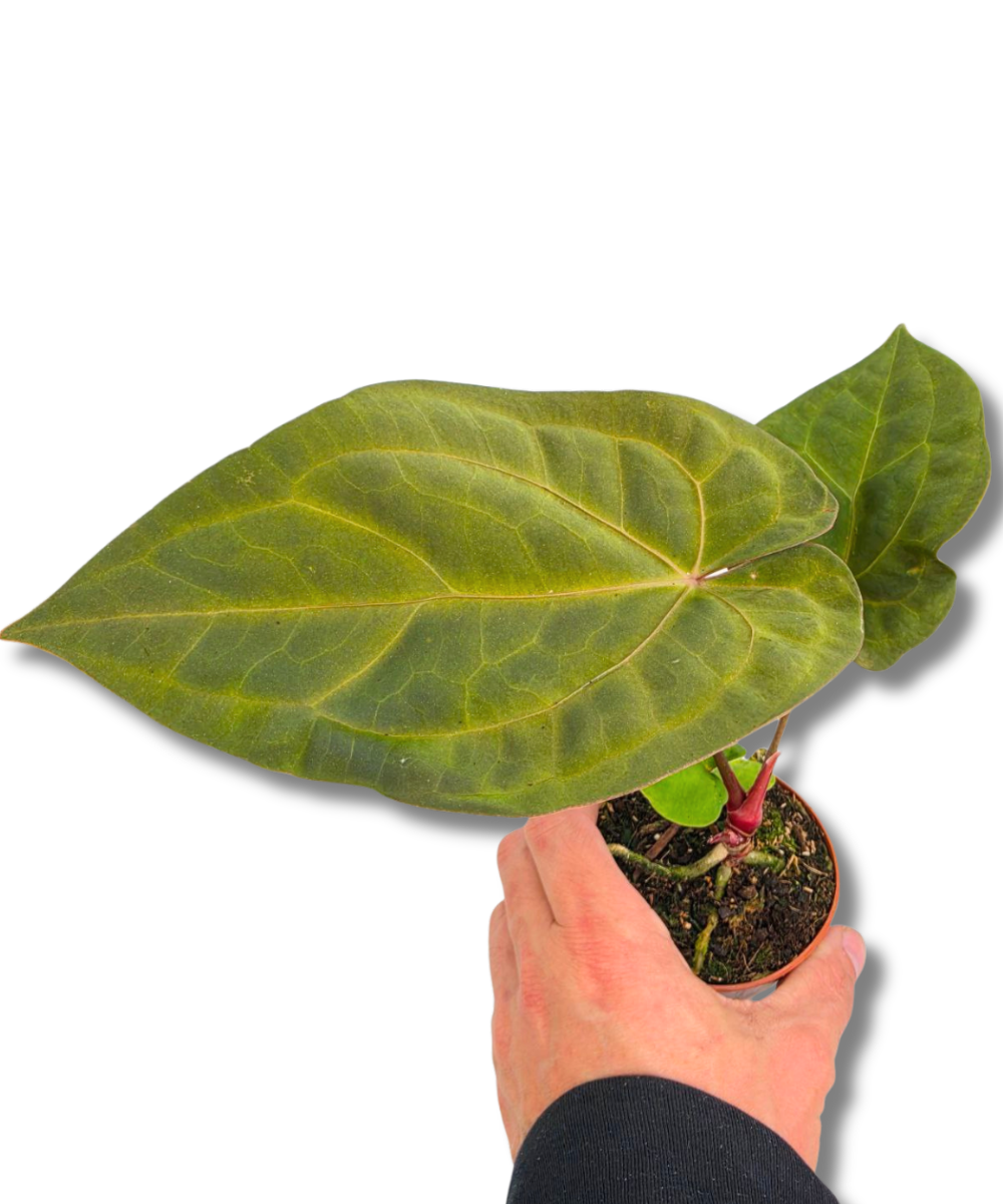 Anthurium King of Spades × Forgetii × Goliath to spektakularna, kolekcjonerska hybryda łącząca cechy trzech wyjątkowych odmian. Roślina wyróżnia się dużymi, aksamitnymi liśćmi w bardzo ciemnym odcieniu zieleni, wpadającym niemal w czerń, z mocno zaznaczonym, kontrastowym unerwieniem.
